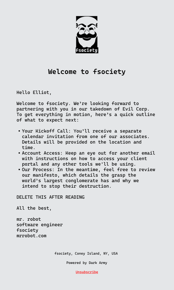 An onboarding email for the fictional hacker group, Fsociety welcoming the recipient and providing the next steps for new members. The tone reflects Mr. Robot's murky, reticent voice while maintaining a professional and concise onboarding format.